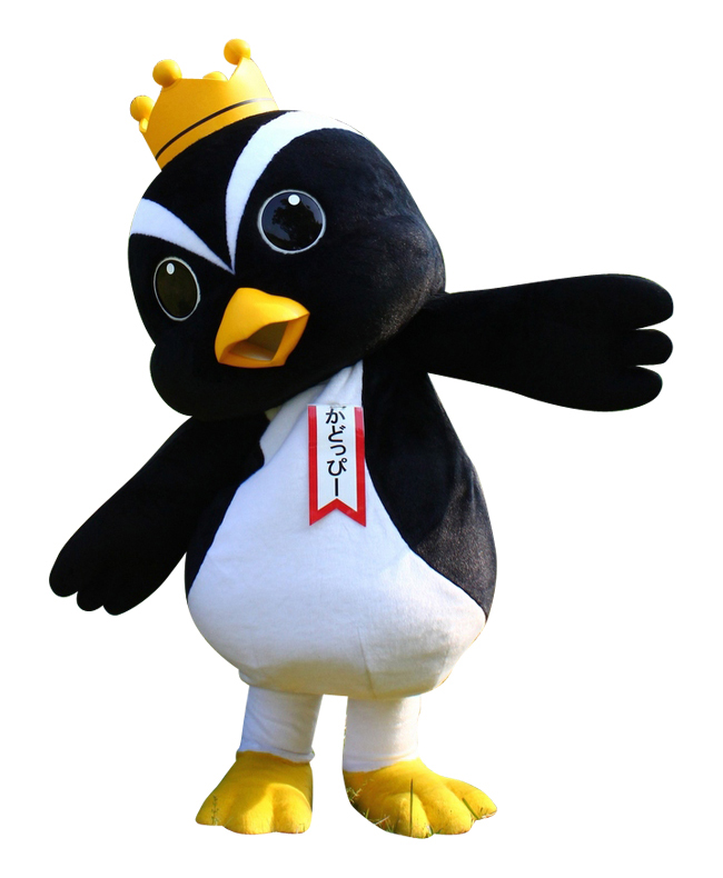 門川町沖に浮かぶビロウ島は、国の天然記念物「カンムリウミスズメ」の世界最大の繁殖地。この「カンムリウミスズメ」をモデルにしたマスコットキャラクター「かどっぴー」。彼の頭にはもちろん冠が輝いているよ。
