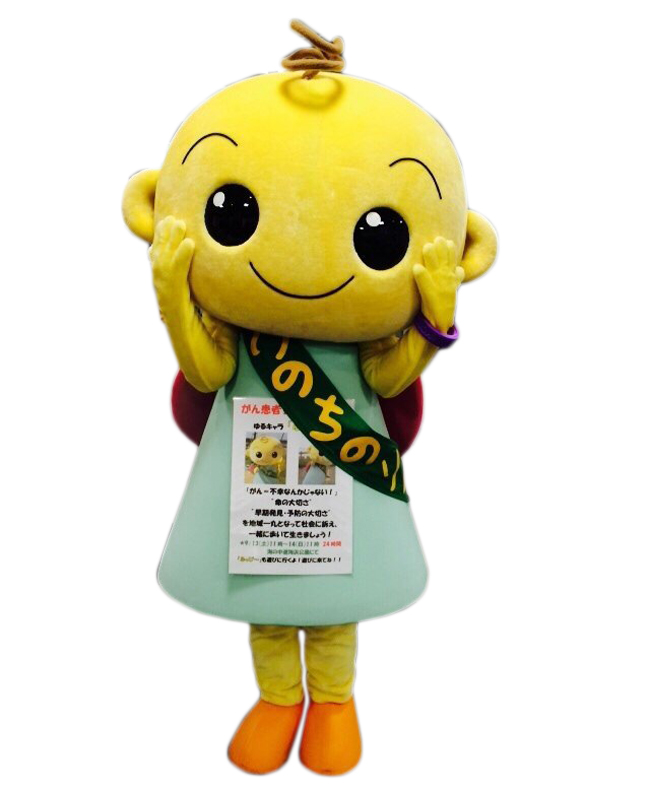 2人に1人が「がん」になる今の時代、ふっぴ~はがん患者支援・がん啓発活動で活躍中です。名前の由来は福岡の「ふ」Happy(ハッピー)の「ぴ~」です。