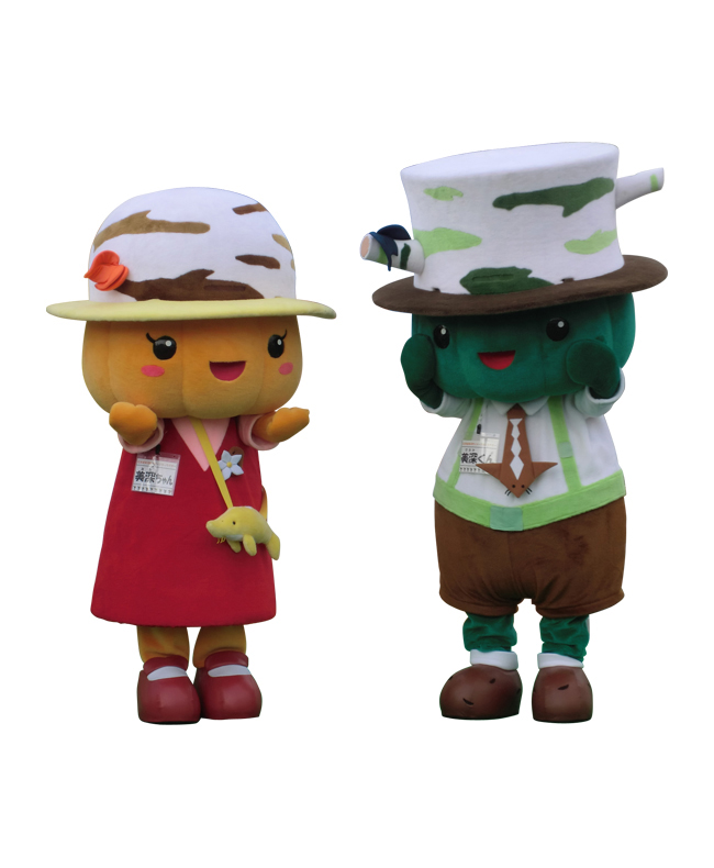 美深町特産のカボチャをモチーフにして、白樺の帽子をかぶっており、美深くんはチョウザメのネクタイ、美深ちゃんはチョウザメのカバンを下げています。