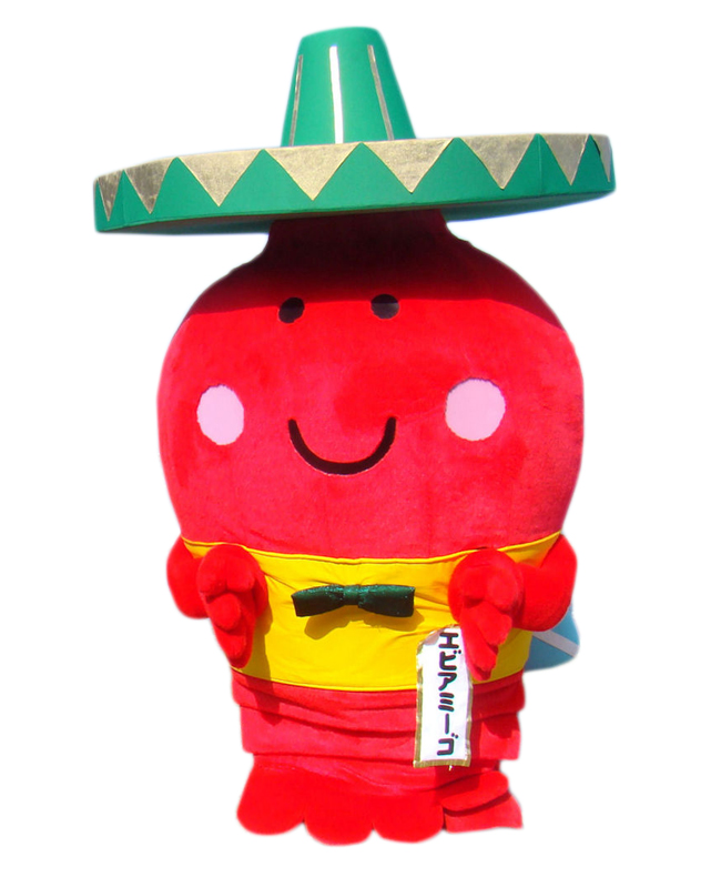 御宿町の特産物「伊勢えび」・童謡「月の沙漠」のモデルとなった美しい海岸を体験するサーフィン・郷土が誇る400年前の史実によるメキシコとの交流を表現するキャラクターです。