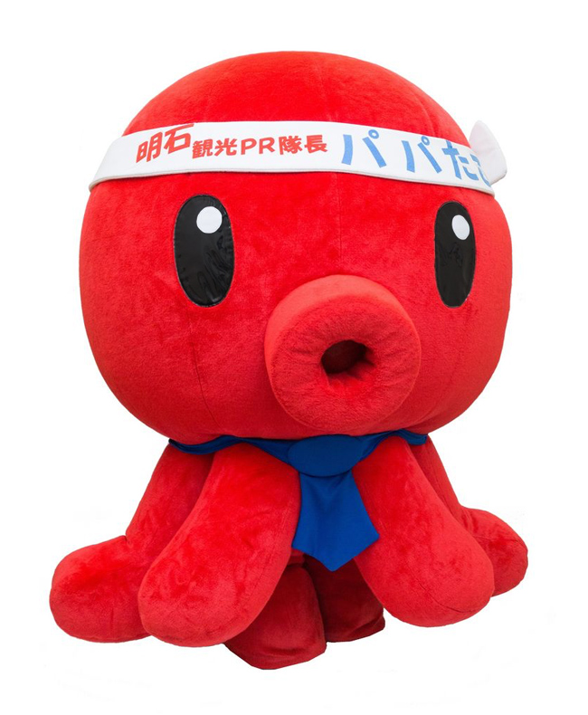 ぱっちりおめめとキュートなお口がチャームポイント!明石観光PR隊長に就任して、はや1年と半年。たこ年齢40歳、たこファミリー8人家族の大黒柱。白いハチマキ・青いネクタイ締めて、今日も元気に明石をPR!