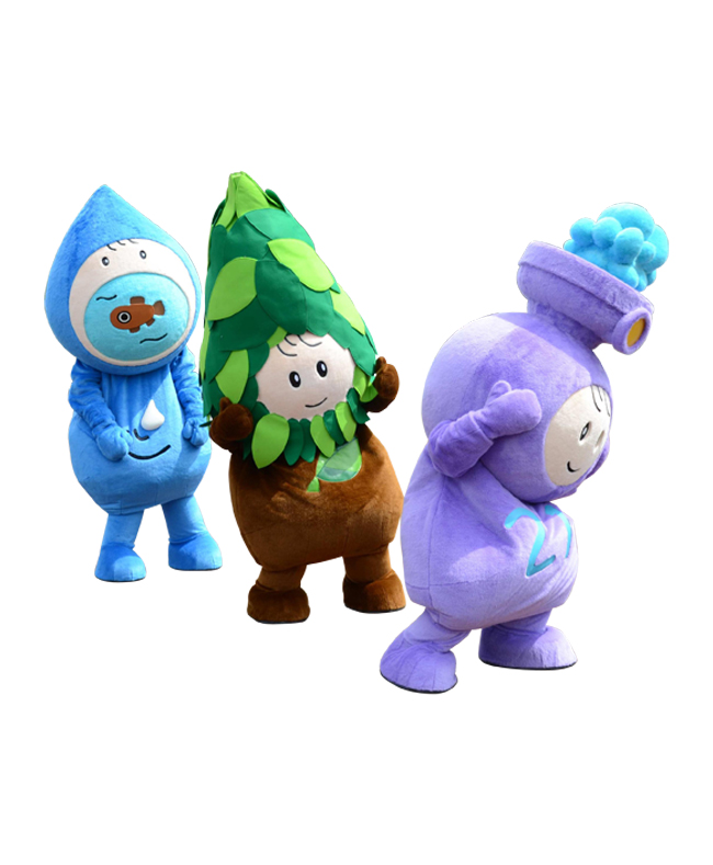 SL・森林・清流のまち「まるせっぷ」をイメージしたキャラたち。まちの歴史的遺産「森林鉄道蒸気機関車 雨宮21号」からあめまるくん。緑あふれる森林からリーモ。貫流する清流から川三が誕生。