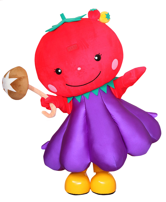 とましーなちゃんは、とまとの顔に、しいたけの傘をもって、天狗なすのスカートをはいた3歳の女の子です。