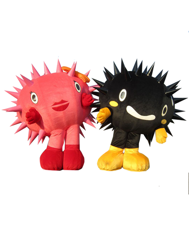 壱岐のグルメ、ウニがモチーフだよ。4~6月にかけて黒ウニ、梅雨明けから10月ぐらいにかけて赤ウニが獲れるんだ。ふたりとも甘みがあってとても美味しいよ!