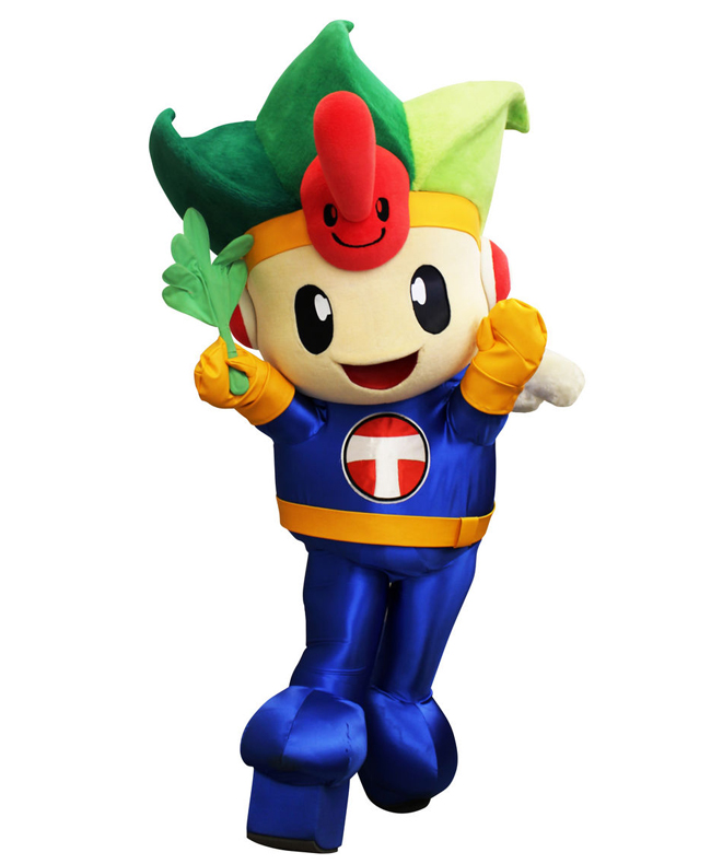 ヒコーキのまち豊山町の未来派てんぐ地空人くん。特技は空を飛ぶことです!2740mの滑走路が必要ですけど。手にするうちわで福を招き入れます。昔、水中訓練中にカメにかまれてしまい、泳ぎとカメは苦手です。