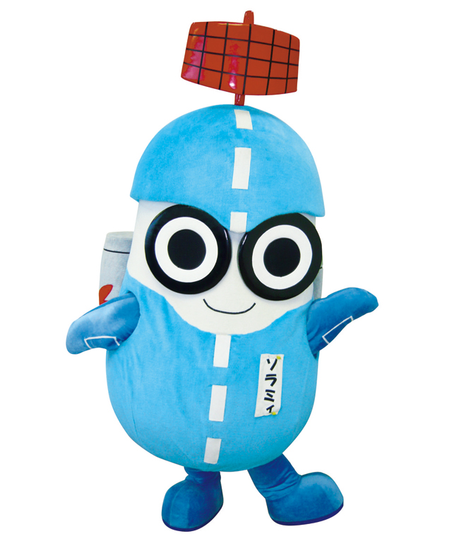 昨年、広島空港開港20周年を記念し、誕生した広島空港マスコットキャラクターの『ソラミィ』です。空港と飛行機が合体した空港初?!のロボキャラです。大きな双眼鏡とレーダーで今日も空の安全に気を配っています。