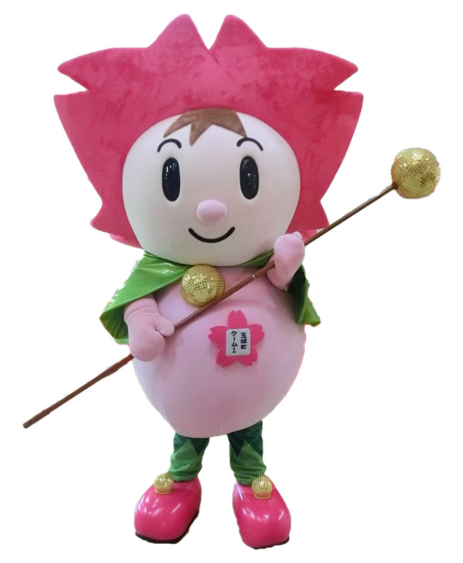 玉城の夢・未来・希望をイメージして名付けられ、頭の形は玉城の花「桜」がモチーフになっている桜の妖精タム。今年で20歳!まつり博三重1994年8月9日に誕生したタム。相棒の「城之介」もよろしくタム。