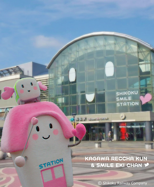 オリーブベリー色の「かがわれっちゃくん」と「すまいるえきちゃん」高松駅にまほうをかけちゃいました