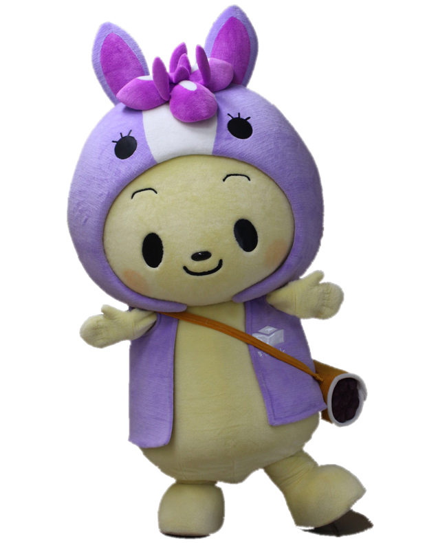 かきつばたのブローチに馬のパーカー、あんまきのポーチを身に付けて、今日も元気に知立市をPRするっぴ!