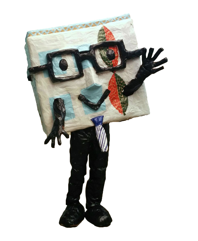 体の形は校舎、メガネは創立者の三木安正先生から受け継いでいます。