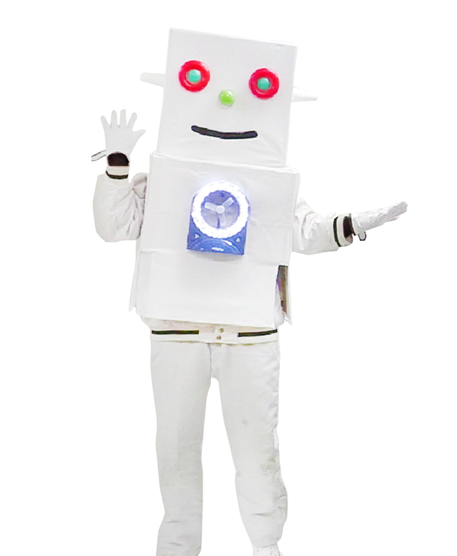 子供向けのイベントや演奏会などで活動中のロボットのゆるキャラです。胸のファンから出る風で、シャボン玉を作って子供たちを喜ばせます。弟分のこさんくんは、和太鼓や鉄琴を自動演奏する本物のロボットです。