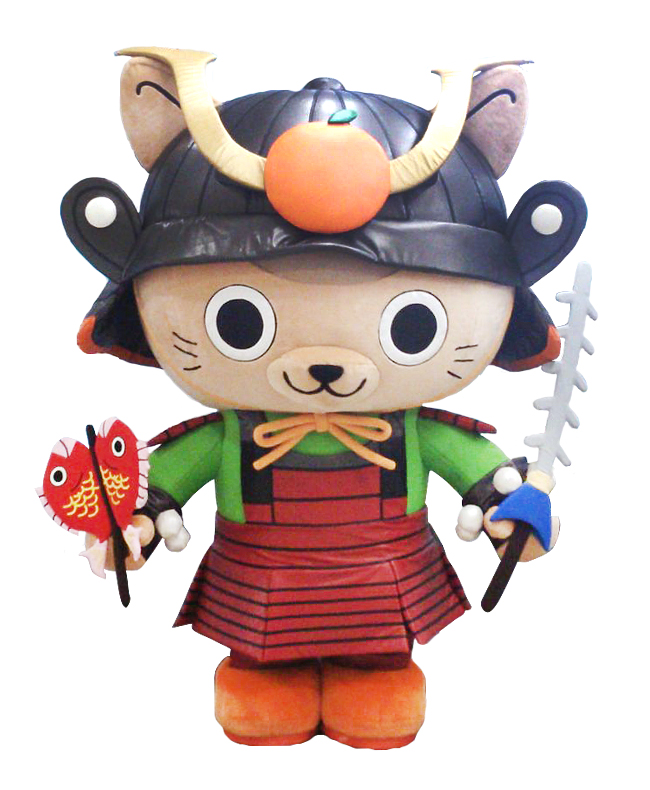 初代藩主・伊達秀宗公の甲冑をかぶり、手には鯛の軍配を持ち、両腕に真珠のアクセサリーをつけ、兜の前立てをミカンとし、背中にはハマチの刀を背負い、全身に宇和島の名産品を身につけています。