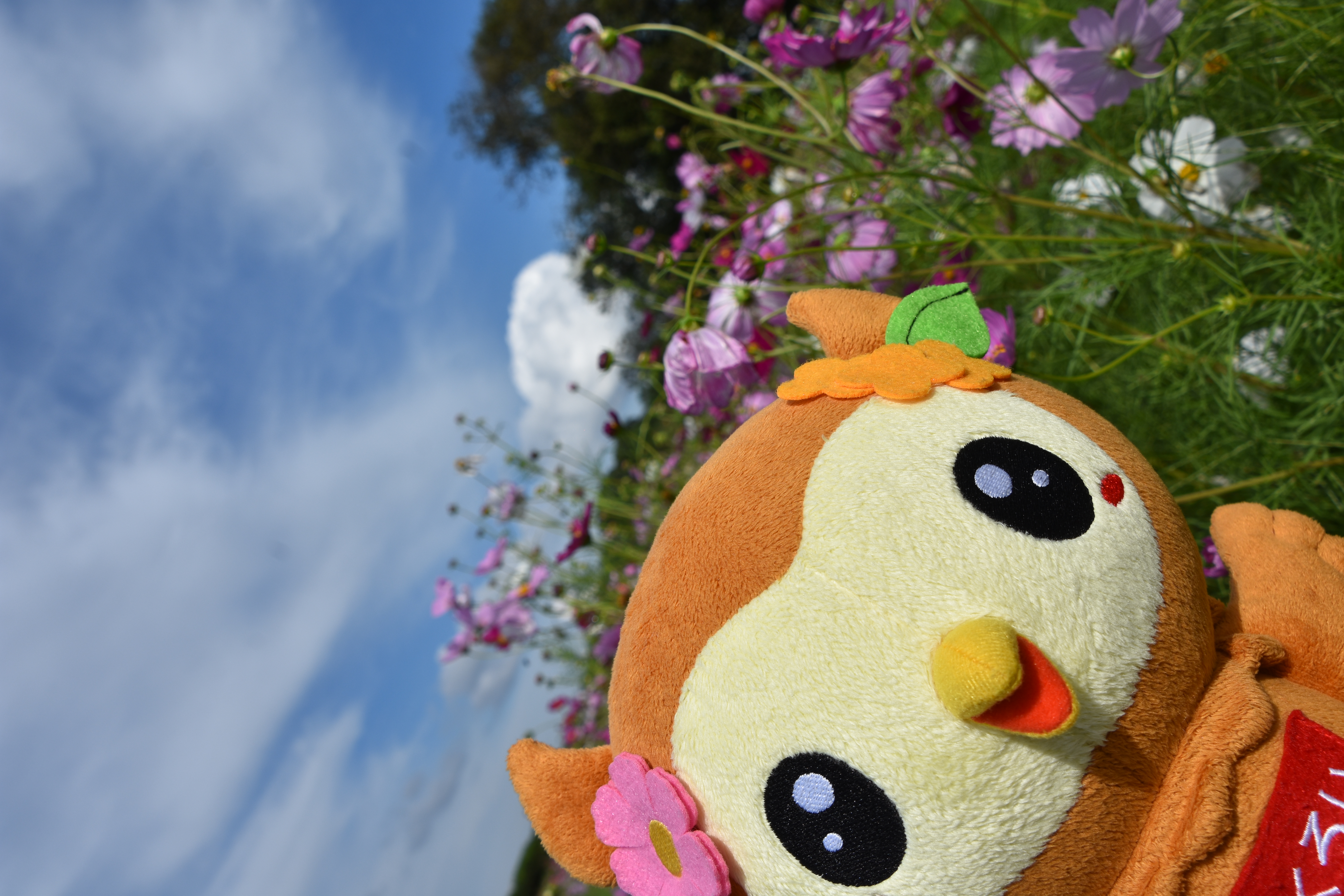 | 名称の由来 | 市の鳥「フクロウ」をモチーフに、市の木「キンモクセイ」と市の花「コスモス」の髪飾りがチャームポイント。翼を広げ元気にジャンプし、飛躍する市の姿がイメージされています。 |