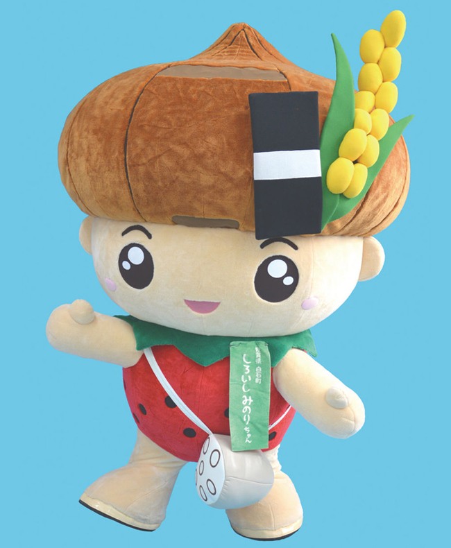 佐賀県白石町の特産物PRキャラクター『しろいしみのりちゃん』です。頭は玉葱、海苔と稲穂の髪飾り、体はイチゴにポシェットはレンコンと、白石町の特産物が一目でわかるようになっています。