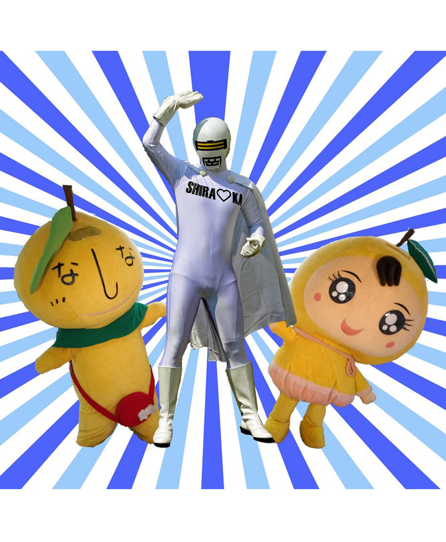 梨のことなら何でも知っている梨農家のおじいちゃん「なしべえ」とおじいちゃんの作った梨がとっても大好きな孫の「なしりん」。2人のお世話役が「シラオ仮面」。きもキャラグランプリなら間違いなくナンバー1!