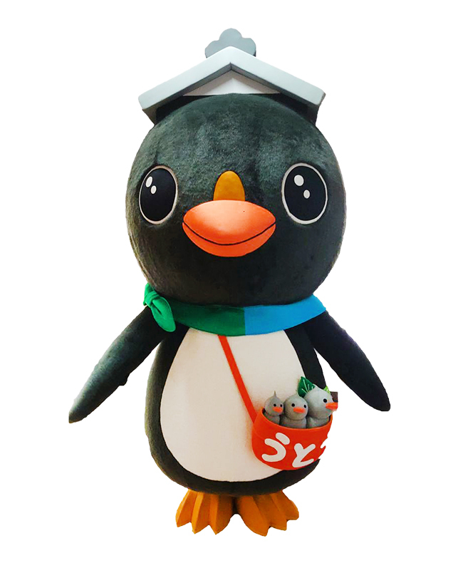 両小野地区の民話「善知鳥峠」を元に作られた通称うとうくんです。水や森の豊かさを表した色のスカーフと空き屋を減らす意をこめ屋根を被った三羽の子持ちのパパです。