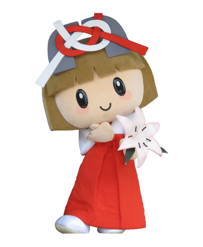“パワースポット”多賀大社の巫女さんがモデル。頭には「叶・多賀門」 をモチーフにした髪飾り、手には町の花「ササユリ」を持ち花が大好 きで、いつも笑顔♪人の心と心を結ぶ「幸せ」を応援している女の子。