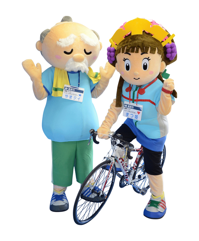 高梁市健康づくりイメージキャラクター。いつもみんなの健康を考えている行動的なお姫様「まつ姫」。そして、姫のおてんばとメタボな体型に悩む、守り役の「やまジイ」の健康PRコンビです。