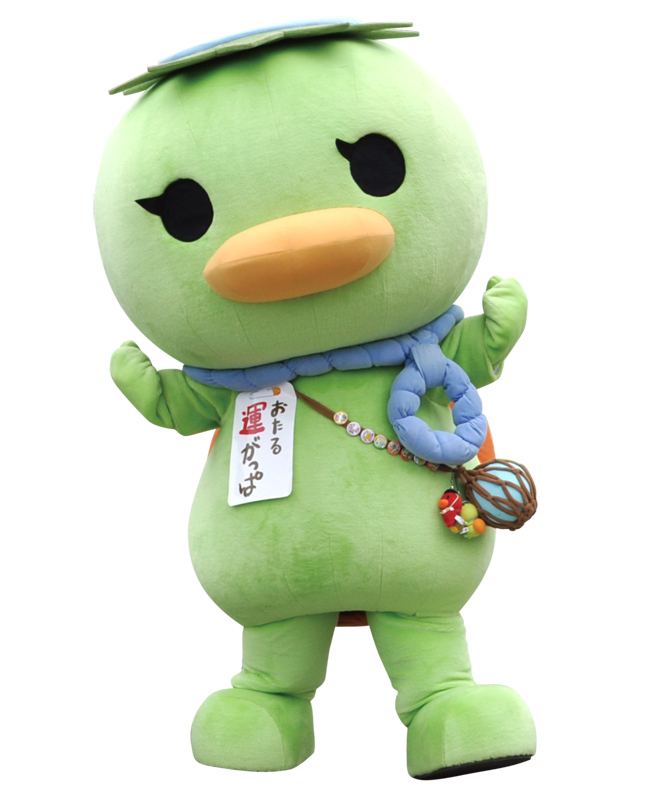 ガラスの浮き玉に乗って大海原を旅していた運がっぱ。流れ着いた“歴史とロマンの街・小樽”が大好きになり、北海道でも有数の観光名所である「小樽運河」に住みついてしまいました。運のついた幸運の名物かっぱです♪