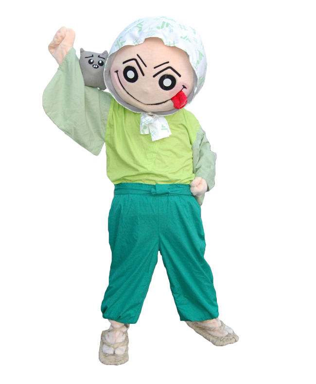ぼくは人間の男の子に見えるけど、田畑で悪さするカラスや虫たちから農作物を守る「かかし」なんです。着物は「植物」や「お茶っ葉」と同じ緑色でなんと光合成ができるのです!