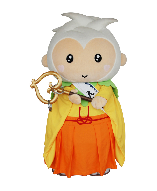 縁結びの御利益で有名な国宝・妻沼聖天山のどこかに住んでいて、頭は聖天様の好物・二叉大根、お顔もほっぺも錫杖もハート形! ぼくに錫杖を振ってもらうと、幸せなご縁が結ばれるかも?