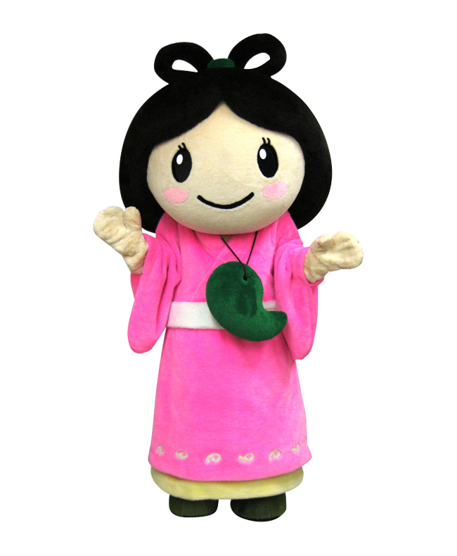 「やさしい笑顔とピンクのほっぺ。他人思いでとても賢い糸魚川の伝説のお姫様。ヒスイの勾玉に触ると賢くなれる?!みんなとジオパークを楽しむために、各地のイベントに参加するよ。」