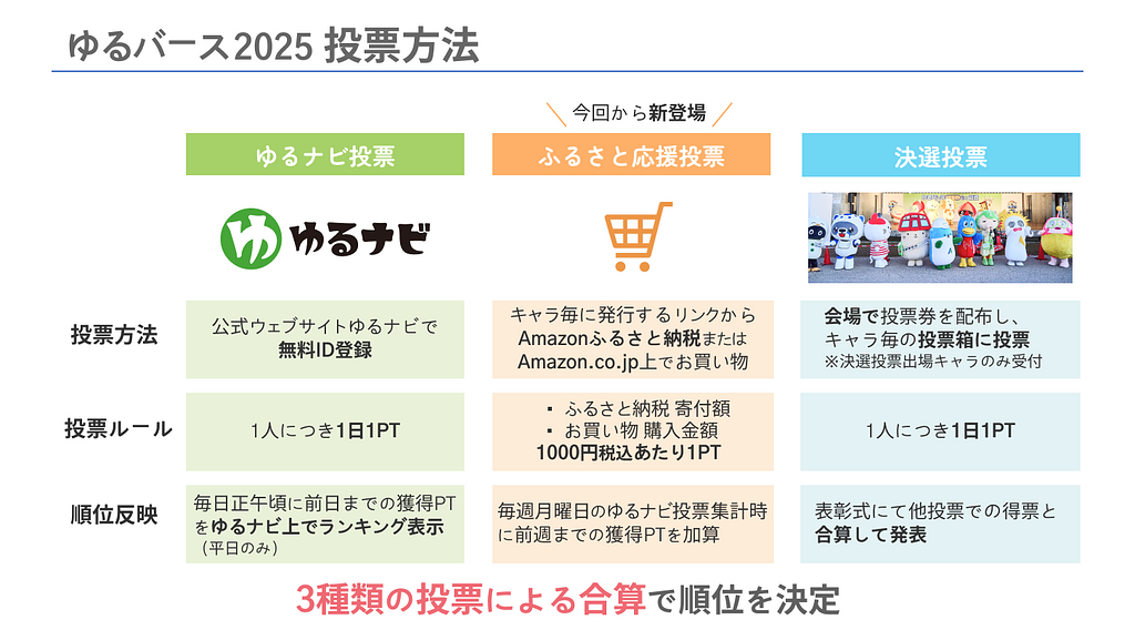 ゆるバース2025では、「ゆるナビ投票」、「ふるさと応援投票」、そして決選会場での投票(2025年9月27・28日開催、於:東京都墨田区隅田公園)による3種類の投票を合算してグランプリを決定します。