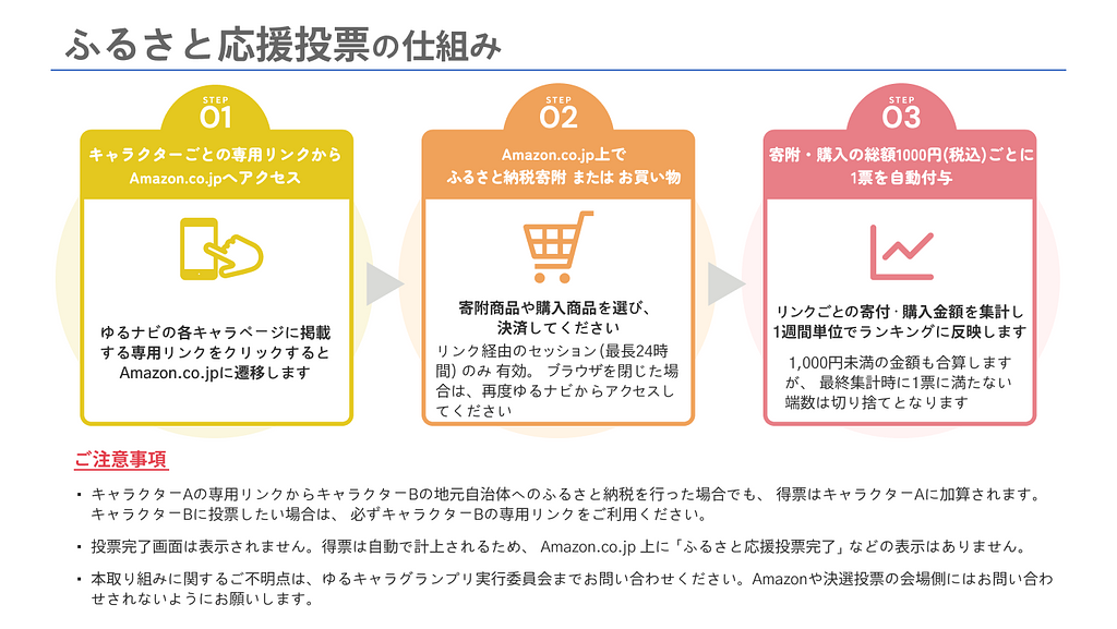 「ふるさと応援投票」は、各キャラクターページに掲載するクリックボタンからAmazon.co.jpにアクセスし、Amazonふるさと納税での寄附や通常のお買物をすると、購入や寄付の合計金額1,000円ごとに1ポイントが自動的に「ゆるバース2025」の投票に加算される仕組みです。