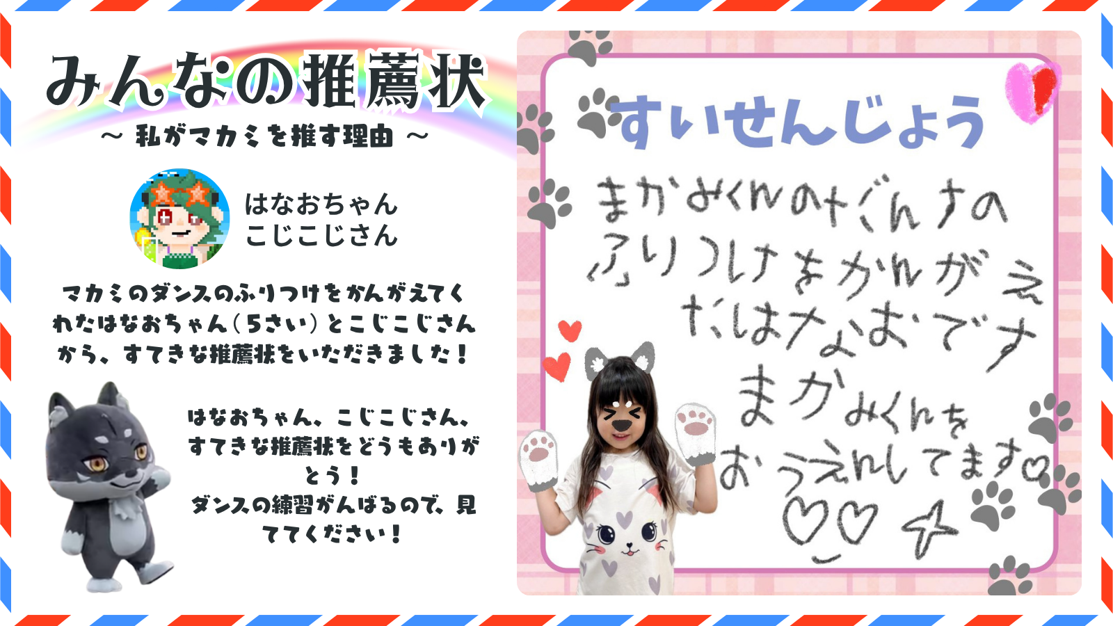 マカミです。今日は、はなおちゃん(5さい)と、こじこじさんからいただいた推薦状を紹介するね。