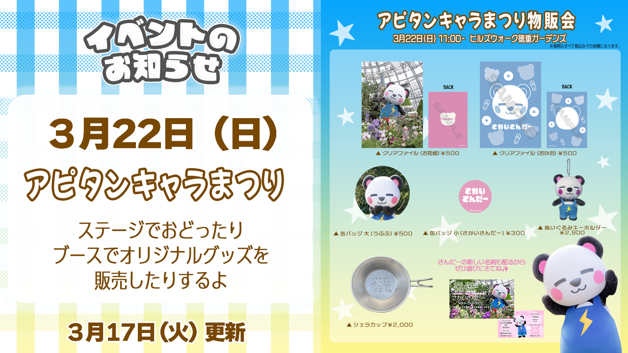 名古屋で開催される「アピタンキャラまつり」に、さんだーも遊びに行くことになったよ!✨
