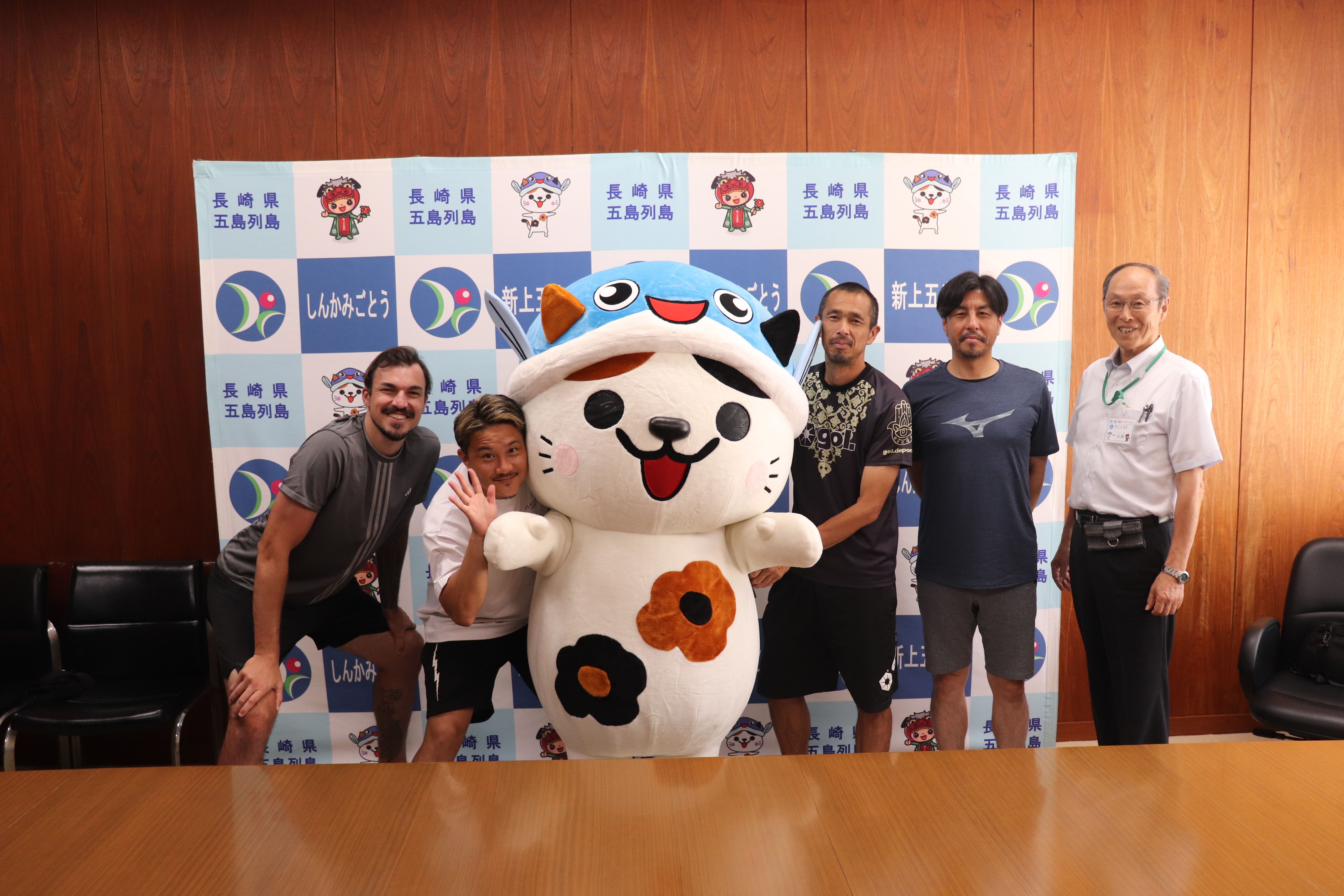 メディア あミ~ご | 新上五島町 憧れのサッカー選手が来島! 2025/07/25 19:28 7月24日木曜日に元サッカー日本代表のハーフナーマイクさん、安田理大さん、久保竜彦さん、元プロサッカー選手の大久保誠さんが新上五島町に来島しました!あミ~ごも一緒に写真を撮ってもらって嬉しそう!一緒にサッカーできるといいね!