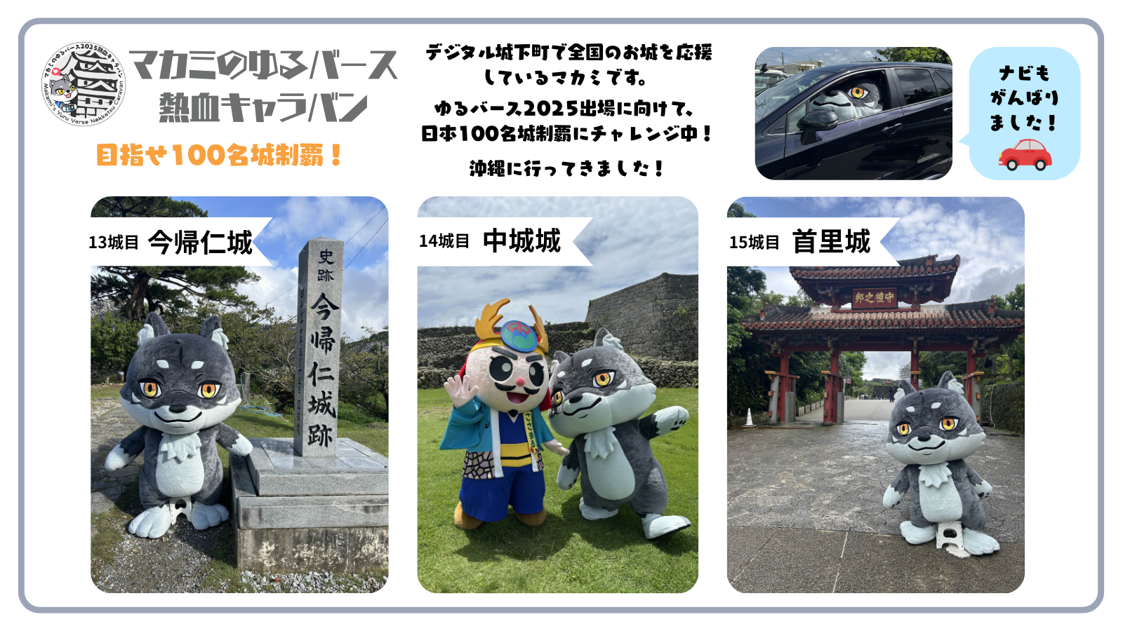 2日間で、沖縄の5つのお城(座喜味城・今帰仁城・中城城・勝連城・首里城)を訪問したよ。これでボクが訪問した100名城は15城になったから...残すはあと85城!