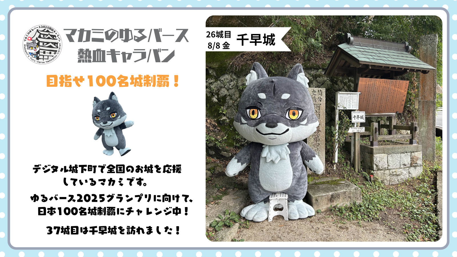 メディア マカミ | CNP 8月8日(金)千早城にてぱしゃり📸 2025/08/11 18:24 千早城にやってきました~!40城目が近づいてきたよ。がぶがぶ~っといくよ~🔥旅の様子はこちらでもチェックしてね🐺https://x.com/makami_cnp
