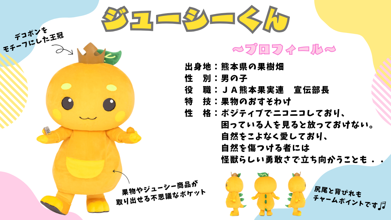 ✨熊本県の果樹畑出身の男の子で、自然をこよなく愛しており特に果樹畑や大自然の中を散歩するのが大好き!自然を傷つける者には、怪獣らしい勇敢さで立ち向かうことも、、、お腹には、いつでも果物やジューシー商品が取り出せる不思議なポッケを持っている。