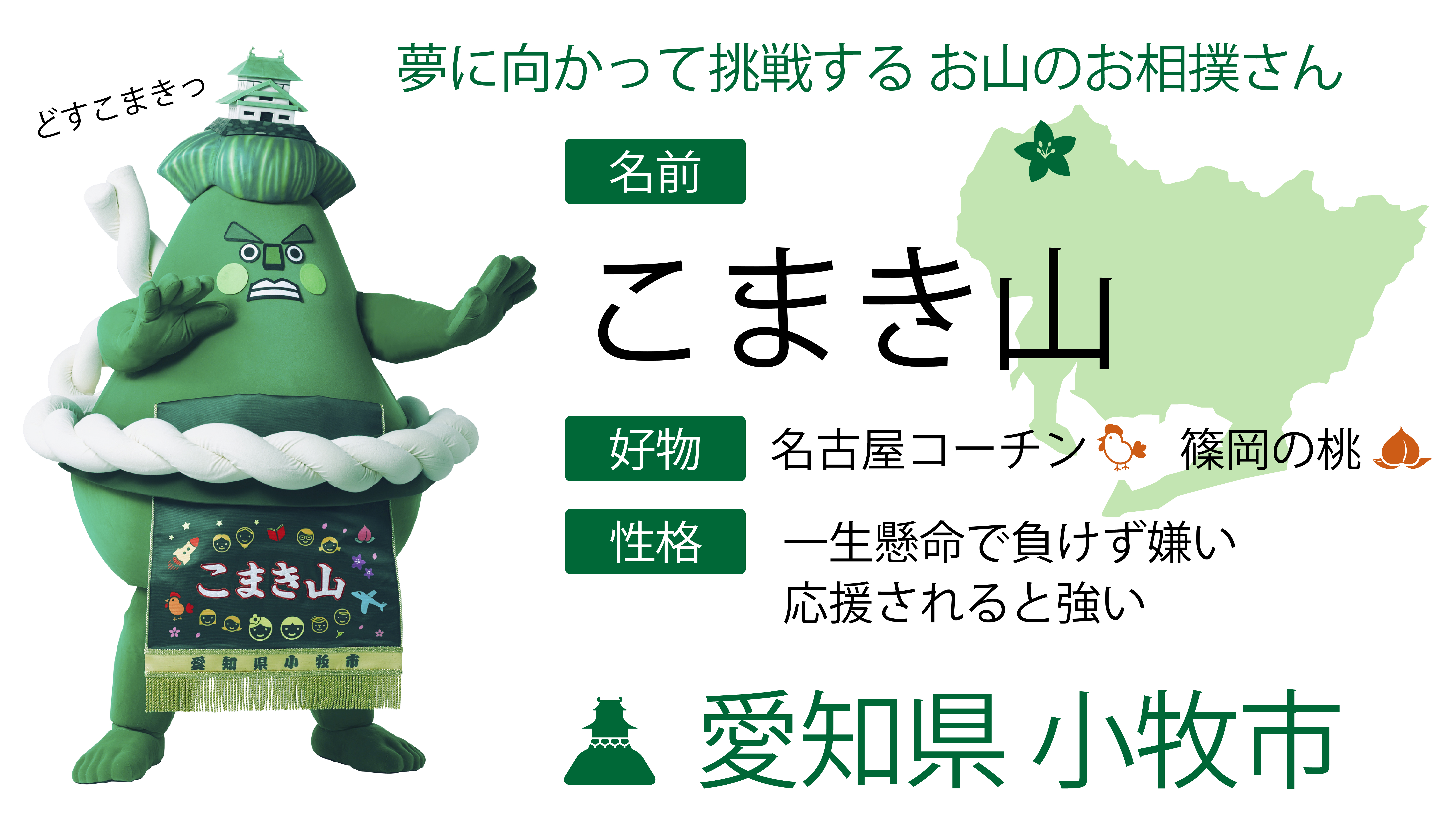 そのままキャラクターに出来る四股名に注目し、お相撲さんのキャラクターになりました。小牧山に、近世城郭のルーツとなる小牧山城を築城した「織田信長」は、深く相撲を愛好していたという史実もあり、きっと小牧山城でも、相撲を楽しんだことと思います。そんな信長の魂も込められて誕生した、夢に向かって挑戦する力士「こまき山」です。