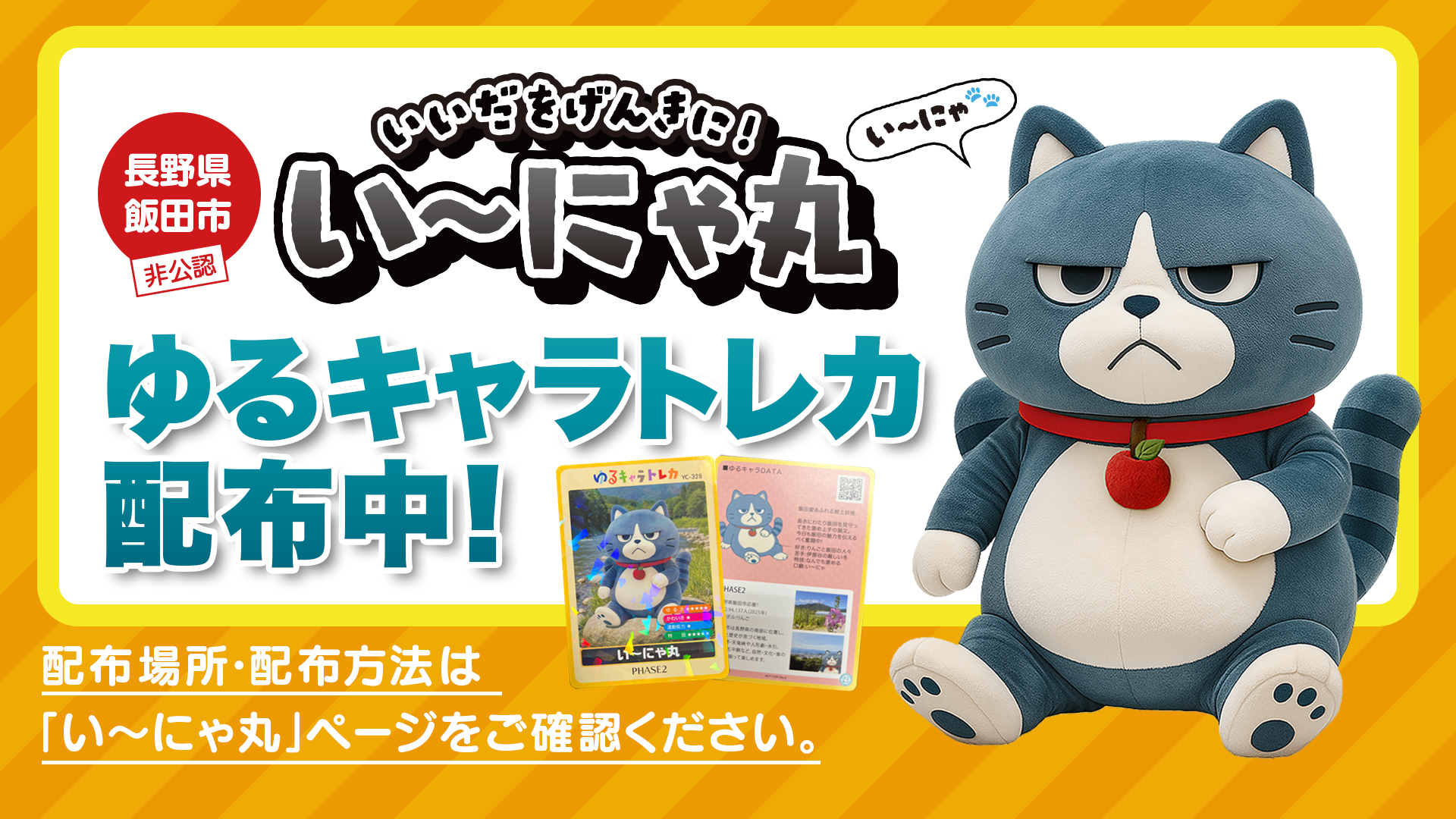 メディア い~にゃ丸 | PHASE2 ❣️い〜にゃ丸 ゆるキャラトレカ配布中❣️ 2025/09/03 21:20 い〜にゃ丸のゆるキャラトレカ配布を開始しました!飯田市の観光案内所3ヶ所と郵送申込で配布中!🐾情報詳細はキャラクターページをご確認ください🐾