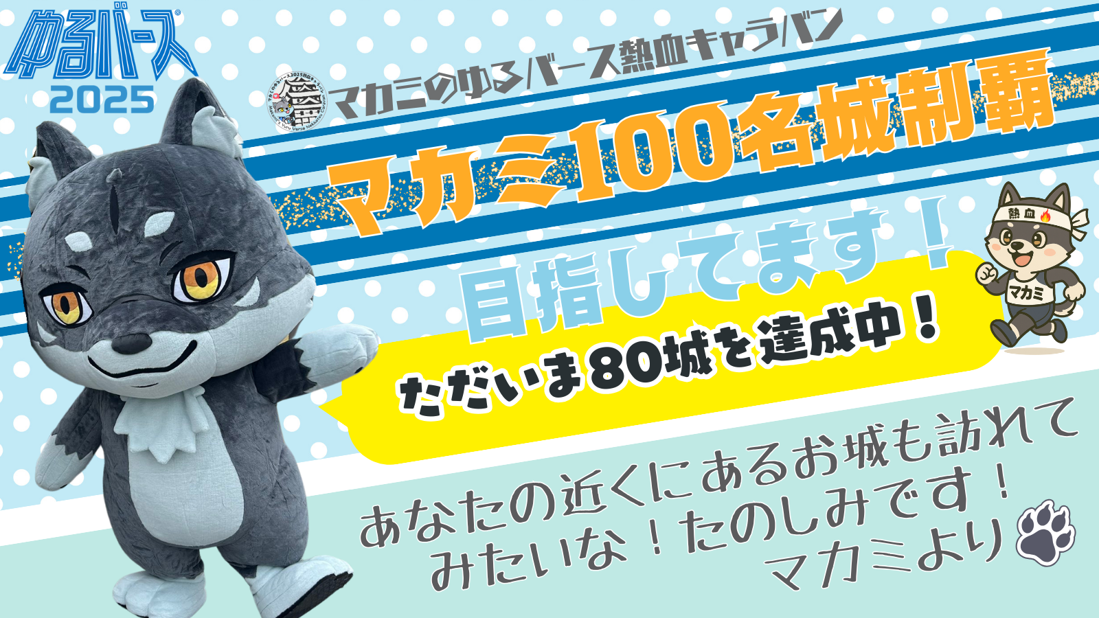 マカミが今チャレンジしているのは、日本100名城を決戦投票までにめぐる「マカミのゆるバース熱血チャレンジ」だよ🎶