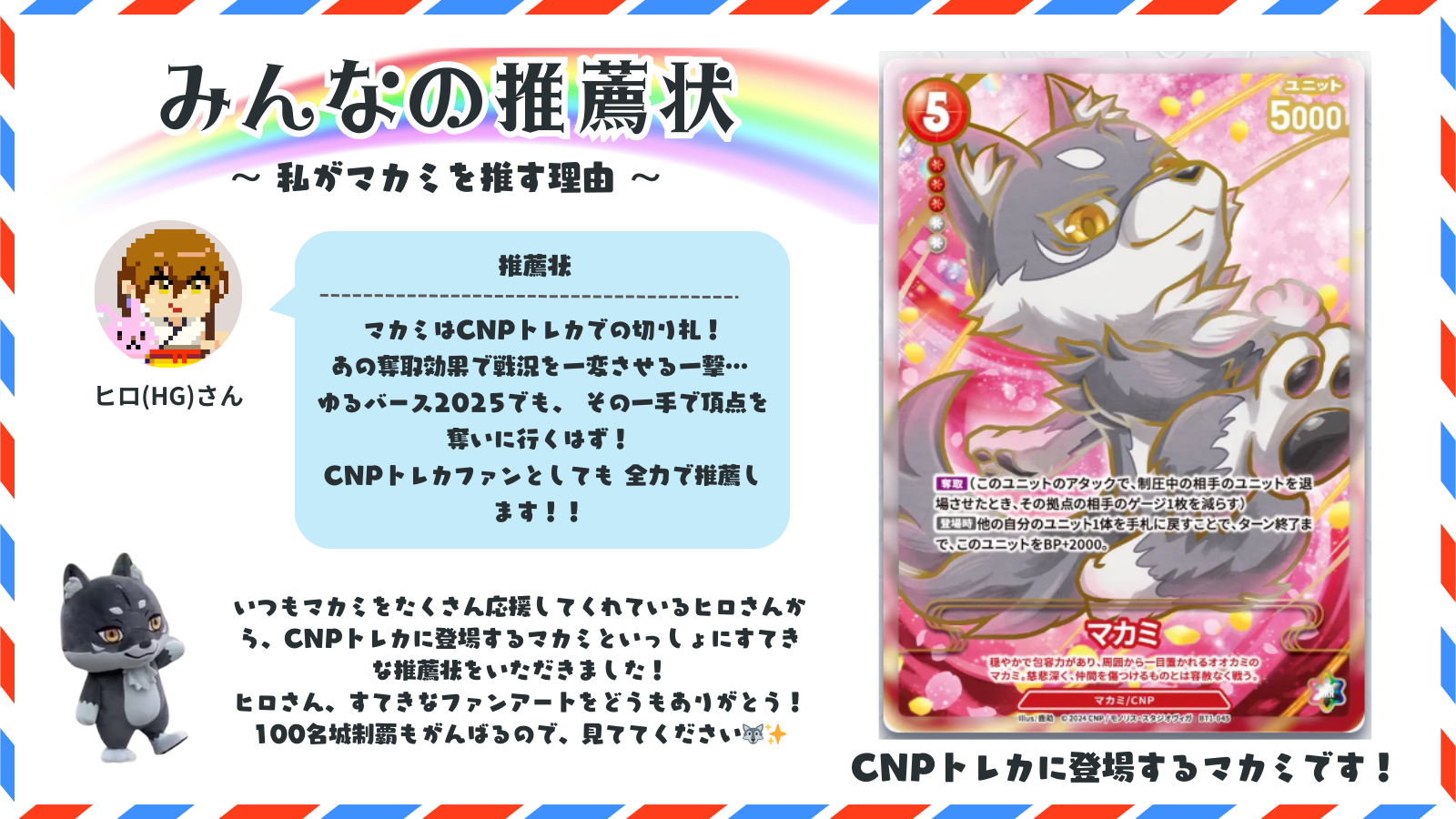 ヒロさんが紹介してくれた推薦状のマカミは、CNPトレカ(CNPトレーディングカードゲーム)に登場するマカミだよ!🐺