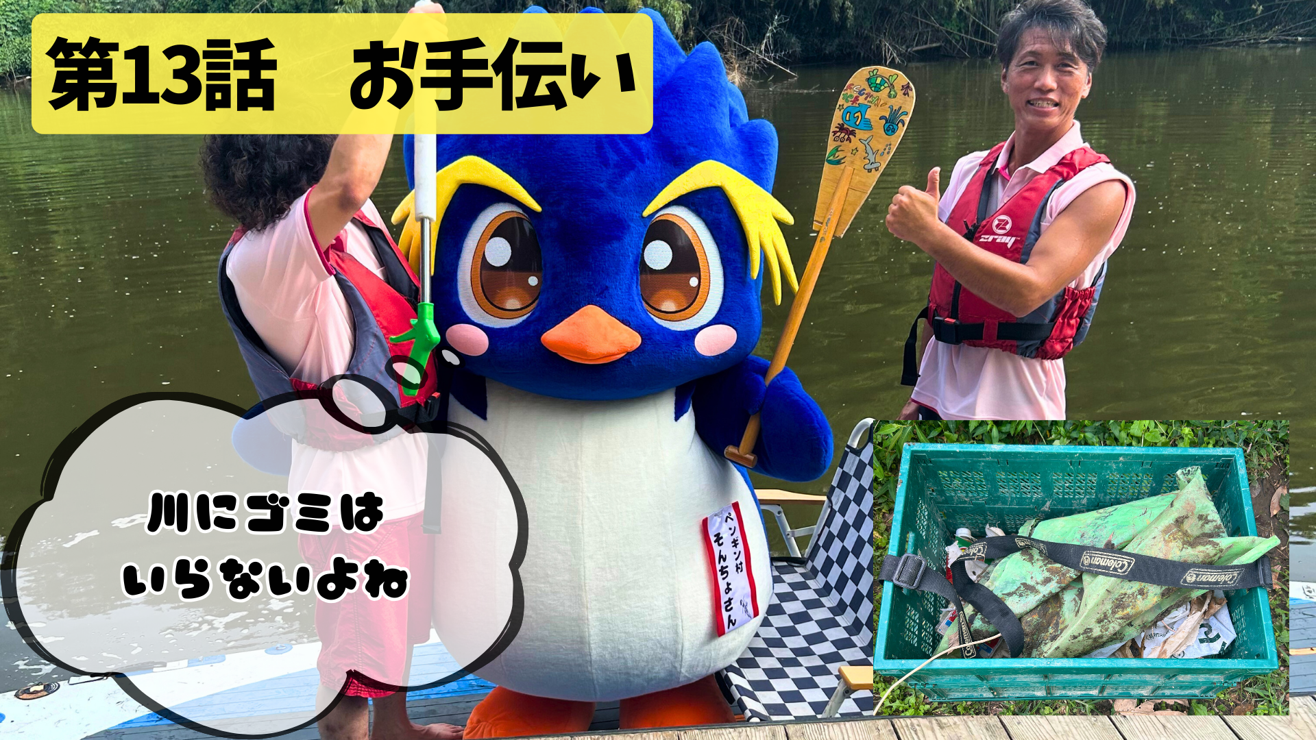 道中、川のゴミ拾いに参加することにしたそんちょさん。