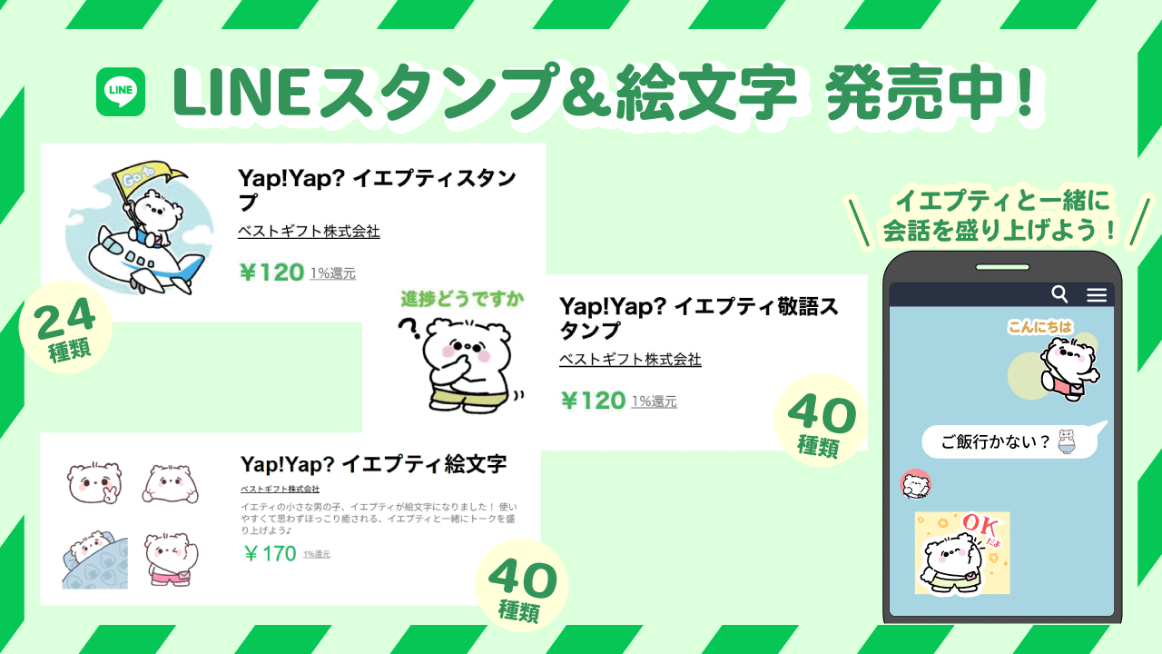 メディア イエプティ | ベストギフト株式会社 LINEスタンプ&絵文字発売中(^^♪ 2025/07/16 17:19 みなさん、こんにちは!ぼくイエプティだよ~。ぼくのLINEスタンプ&絵文字が好評発売中!!楽しく使ってね(^-^)vここからチェックしてね!!