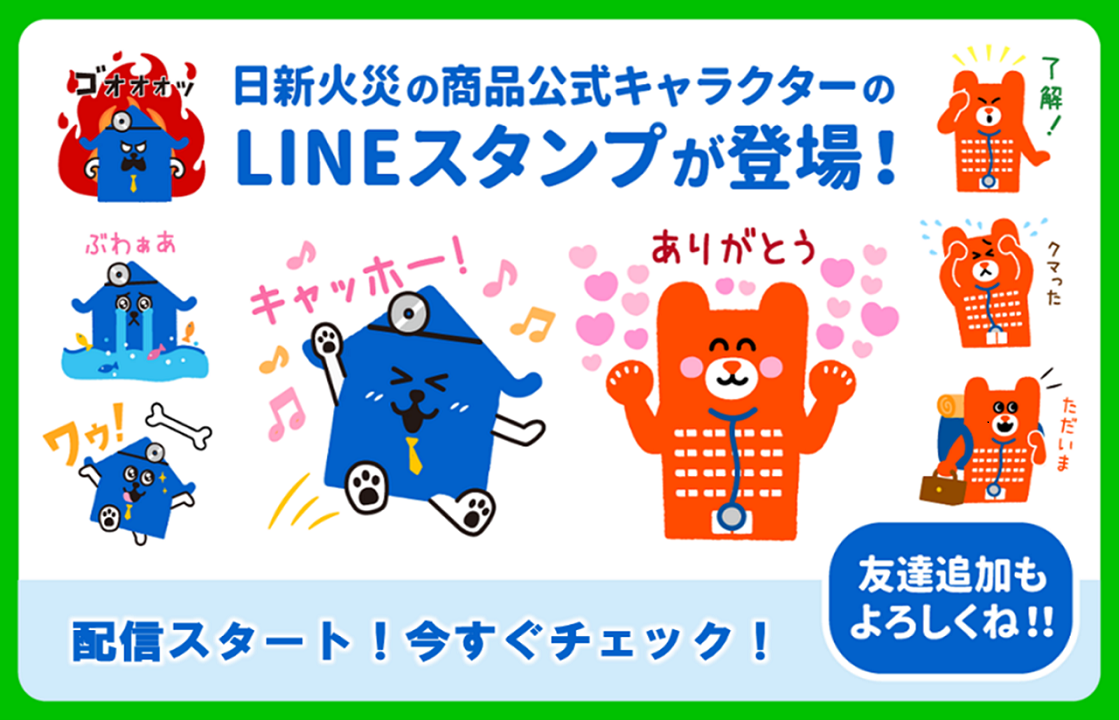 日新火災の商品公式キャラクター「日新火災の青い犬」と「クマンション」のLINEスタンプが配信開始!!✨