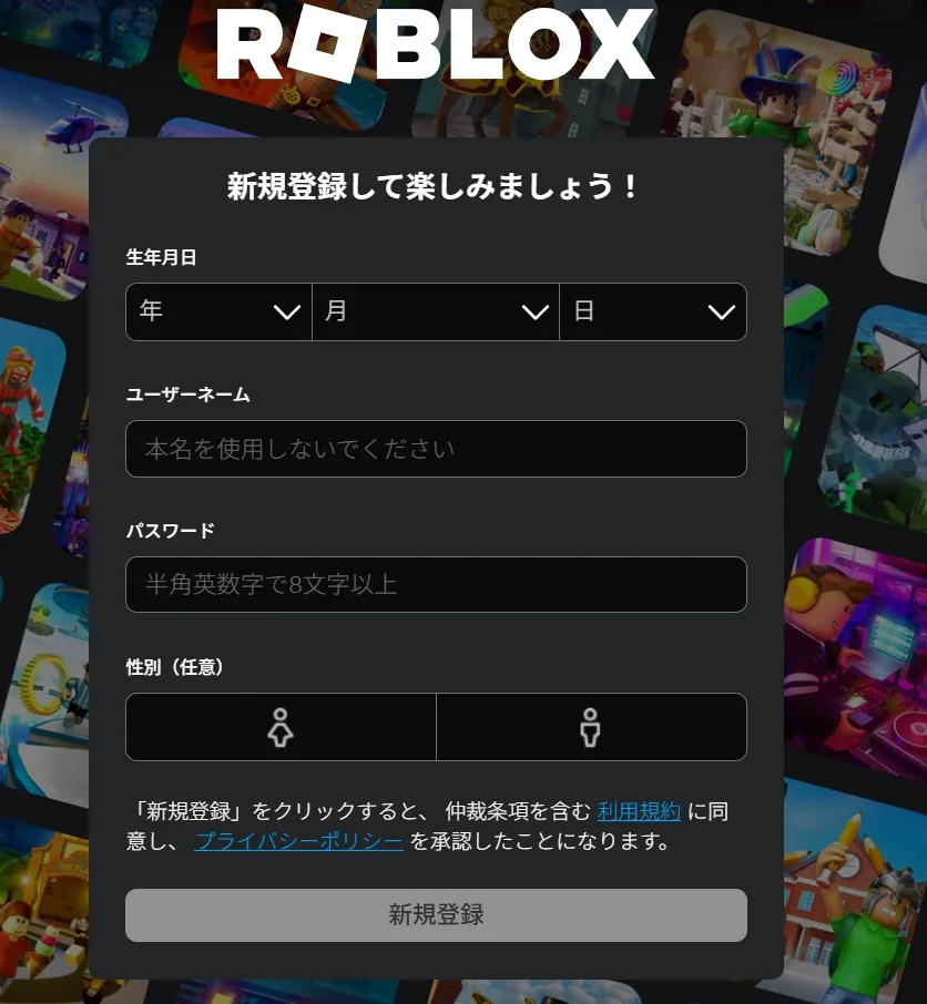 スマートフォンやタブレット、PCでRobloxで遊ぶために、無料のアカウント登録が必要となります。