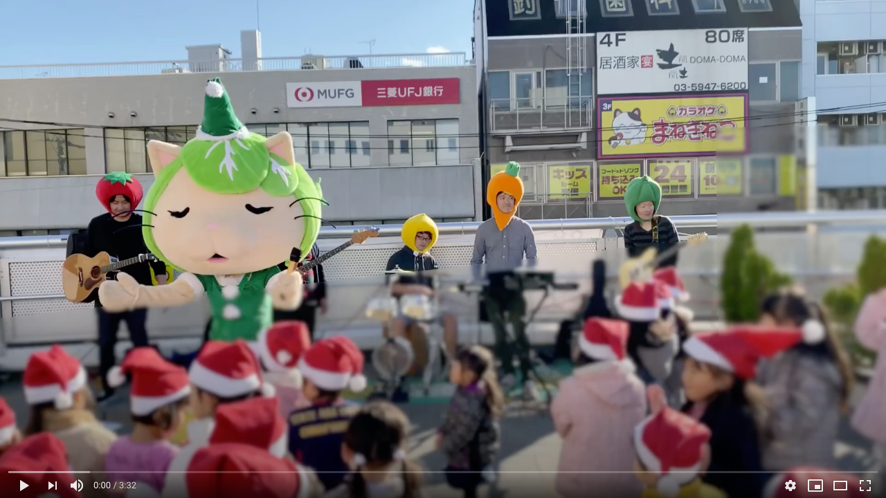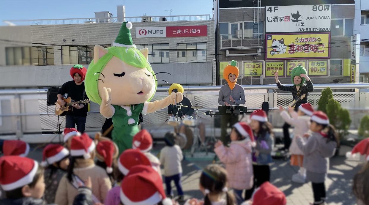 ミックスベジタブルというお野菜メンバーと一緒に子ども向けの歌を演奏しているにゃべ