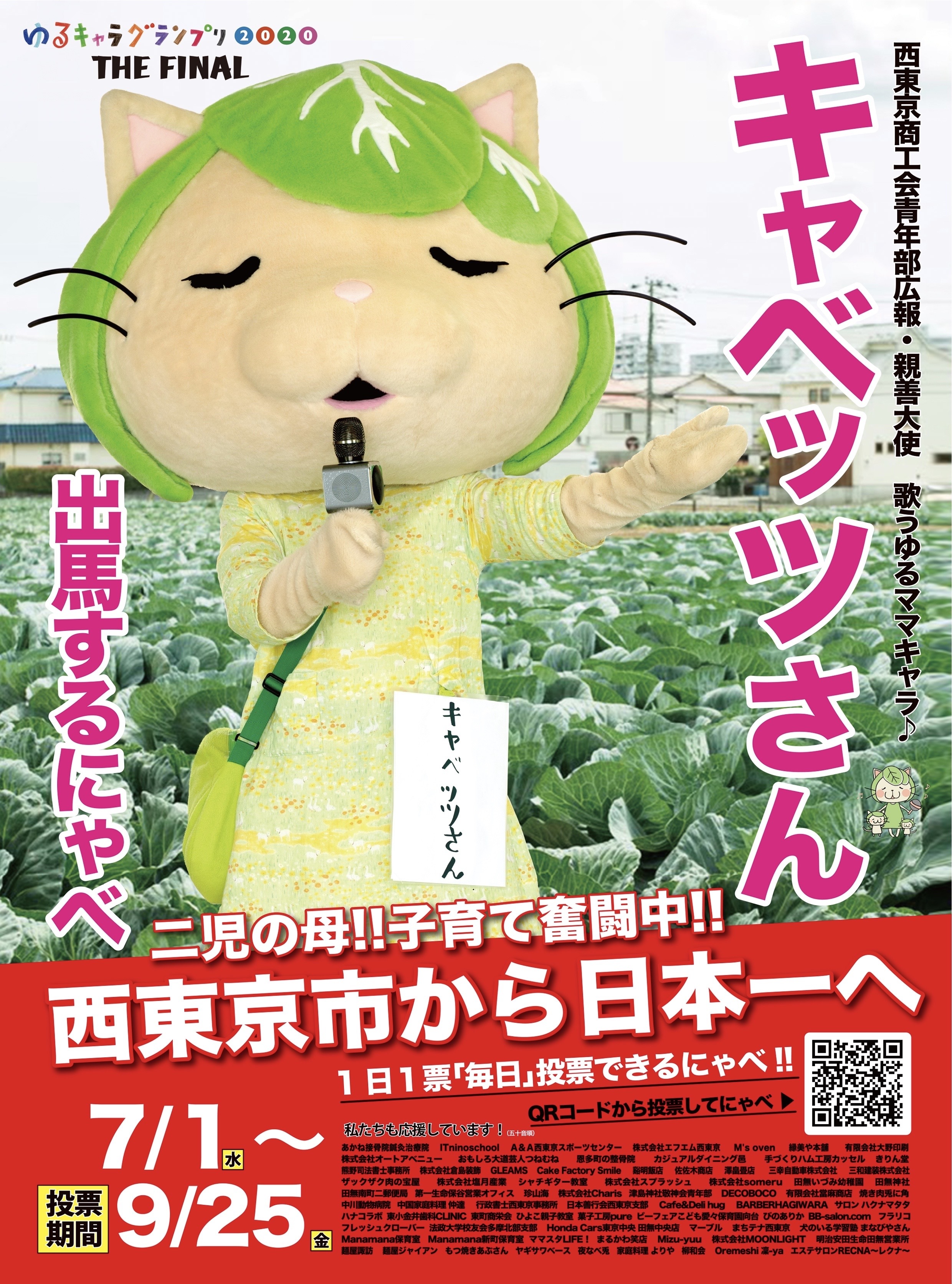 | キャベッツさん | 「こんにちにゃべ! キャベッツさんは2人の芽キャベッツの「ママ」で歌がとっても得意にゃべ♪ 子どもたちと一緒に歌うのが大好きにゃべ♪ 西東京市の商工のPRや、西東京市は親子の笑顔があふれる街ということを全国に発信しているにゃべよ。」 | |