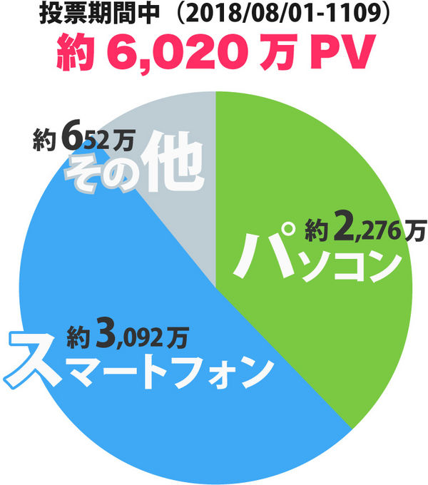昨年の投票期間中(2018/8/1〜11/09)は、パソコンから約2,276万、スマートフォンから3,092万、その他のゆるキャラグランプリ関連サイトを含め約合計6,020万ものページビューがありました。