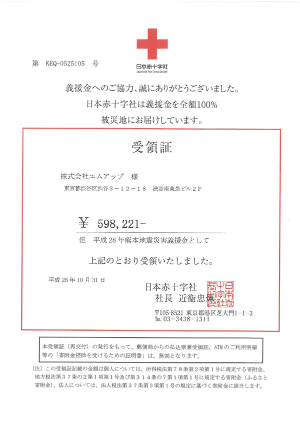 【平成28年熊本地震 支援チャリティ】災害義援金納付のご報告