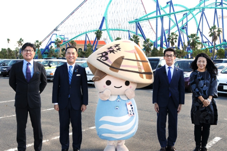 ゆめはまちゃん(「はまぐりのまち・桑名」イメージキャラクター)、伊藤徳宇(桑名市長)、大谷恭代(長島観光開発株式会社取締役)