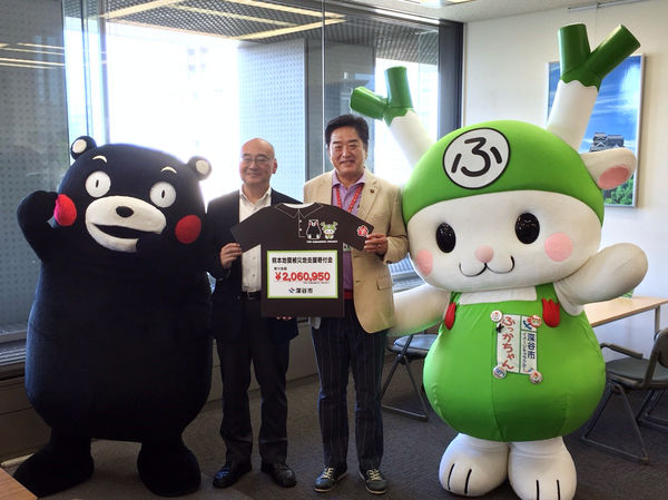 この寄付金の原資は、深谷市における熊本地震被災地支援の取り組みの一環として、熊本県PRキャラクター「くまモン」と深谷市イメージキャラクター「ふっかちゃん」のイラストが入ったポロシャツを販売し、その収益の全額約200万円のほか、7月2日に深谷市内で開催した「ふっかちゃんバースデイぱーちぃ2016」で販売した「ふっかちゃん」のイラスト入り缶バッチの収益金6万となります。