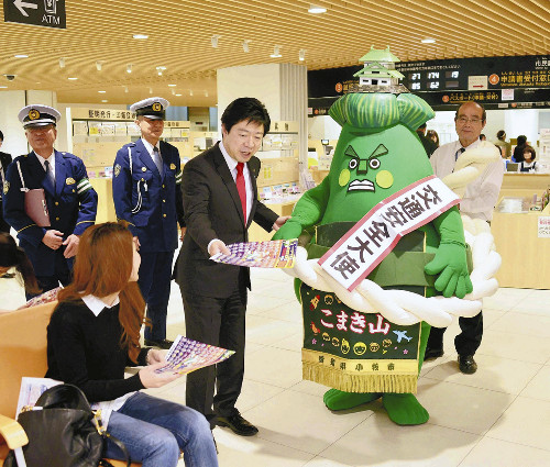 委嘱式は同市役所で10日に行われ、小牧署の清水啓任署長が「交通安全のために先頭に立って頑張ってください」と激励した。こまき山は早速、山下史守朗市長と一緒に市役所で交通安全のチラシを配布して、PRしていた。今後は、県警の交通安全活動のイベントなどに参加する予定。