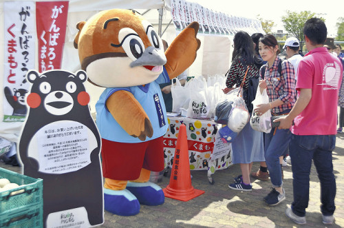 くまモンが描かれたボードの横で、もずやんが同経済連の職員らとともに購入を呼びかけると、多くの家族連れらが列を作った。豊中市の会社員萩原宜和さん(36)は「被災地を少しでも何か応援したいと思いました」と買い求めていた。